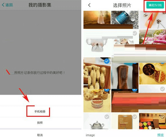 2)接着我们点击【手机相册】,在手机相册里选择不低于5张的照片,选好之后点击右上角【确定】;(如下图)