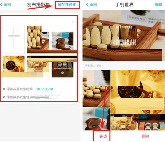 3)再按要求填写标题,时间及地点,填写完成之后点击右上角的【保存并预览】,跟着点击左下角【完成】;(如下图)