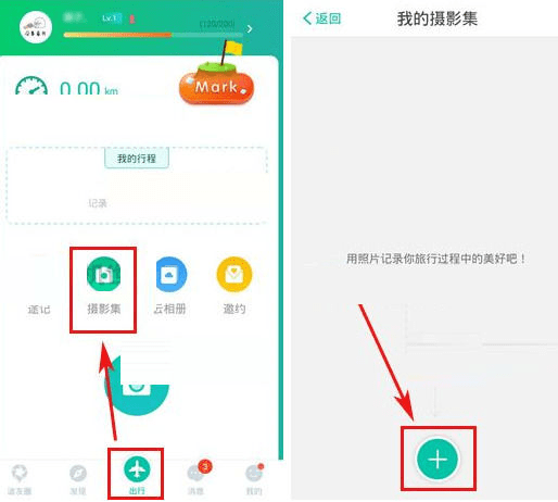 1)打开软件,点击最底部的【出行】,然后点击【摄影集】,之后点击【+】符号;(如下图)