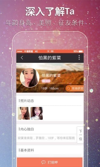 2、爱聊天:同心目中的美女、女神、帅哥尽情沟通,释放情感,摆脱无聊、寂寞。