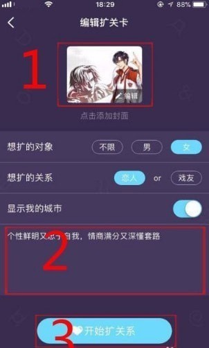 填写“扩关卡”步骤:登录--发现--“扩关系”--编辑扩关卡(如图所示)。重要的是填写自己的封面和自我介绍(即图中“1”和“2”)。