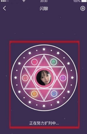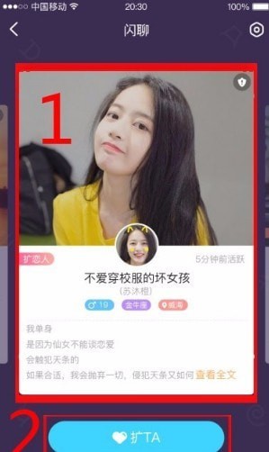 等待之后会出现诸多闪聊网友供自己选择,左右滑动图中数字“1”区域实现切换,如果对这位“不爱穿校服的坏女孩”感兴趣,点击下方“扩Ta”。