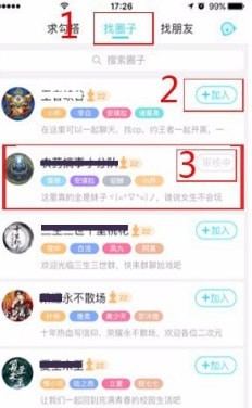 加入圈子的操作:进入“扩列”页面(如图),点击找圈子(操作“1”)点击加入(操作“2”),显示“审核中”(操作“3”)后,等待圈主回复即可。