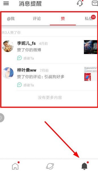 3、通过右上角按钮成功发布微博消息后,我们在点击主页右下角的按钮进入消息页面,这样就能够查看微博的评论或点赞的信息!