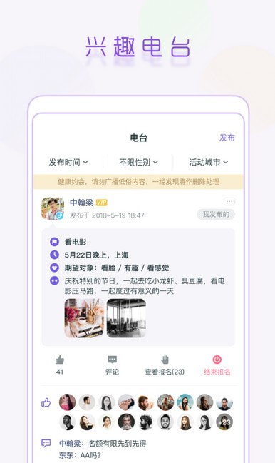 面具公园app是高颜值的同城社交应用,在这你可以与单身朋友互动聊天,你也可以寻找属于你心仪的对象,如果你看中了千万不要犹豫,快来大胆的表白吧,同时还可以组织一场线下约会,这样既可以提高交友的成功率也确保了交友的安全性,助你好运哦,这样就不需要爸妈为你安排相亲活动了,就不需要因为身边没有异性朋友而发愁。