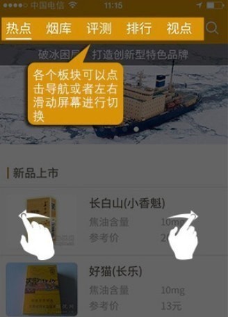 名烟包括热点、烟库、评测、排行、视点和搜索六个栏目。左右滑屏能切换栏目,向下滑动屏幕刷新,向上滑动屏幕可加载更多内容。