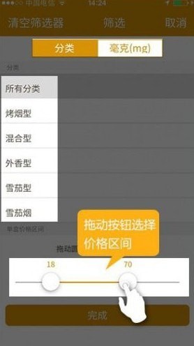 筛选时顶部有两种筛选选择,既可以根据不同的香烟类型和价格区间进行筛选,还可以根据焦油量、烟气烟碱量、烟气一氧化碳含量进行筛选。