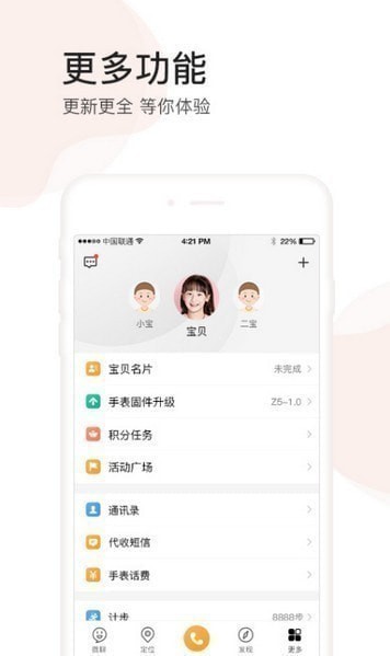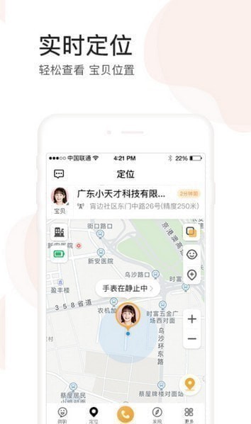实时的语音聊天,与孩子更加便捷的沟通,使家庭关系更加亲密和融洽;上学守护:在孩子上下学时实时的守护孩子的安全手表