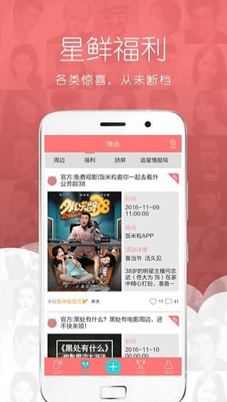 3、动态页根据自己的选择明星家族而呈现内容瀑布流,即使没有关注任何一人,饭米粒内容发布也会推荐观看。小编登陆后刷新的第一时间就呈现了张艺兴的福利活动参与征集,还有罗志祥全球巡演北京演唱会上与黄渤的饭拍高清图集,视觉感受粉丝角度五颗星。