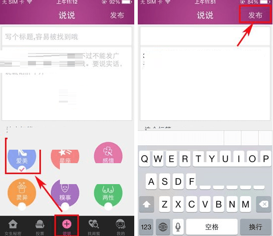 1)首先打开女生秘密,在界面点击【说说】,选择一个标签,在界面输入标题和内容,最后点击【发布】。(如下图)