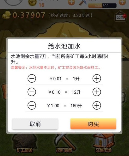 进去的界面如图,挖矿属于全自动不需要管理。但是,水池中缺水,矿人将停止挖矿,所以需要及时补水。