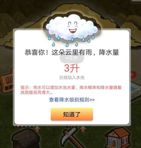 另外下雨是APP上部会一段时间出现三朵云,点开之后根据运气获得水,不是百分之百获得,需要花0.5元购买雨神龙王后才能100%获得雨水