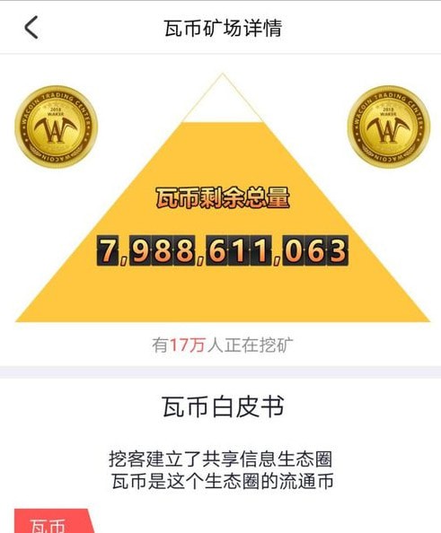 据其APP介绍:瓦币是一种在挖客生态里用于衡量信息交互价值的可以自由使用和交换的稀缺资源。固定储量100亿个,其中20亿由特定投资人认购,剩余80亿瓦币用于挖矿和流通。