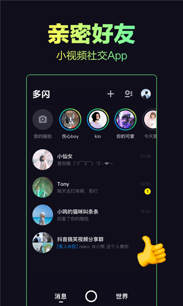 多闪还能将短视频发布在世界中,当你的视频动态发布之后,在“世界”中,有了你的世界,也可以在这个世界中发现熟悉的人,那些搁浅的关系,借用一句话:哇,你也在这里。