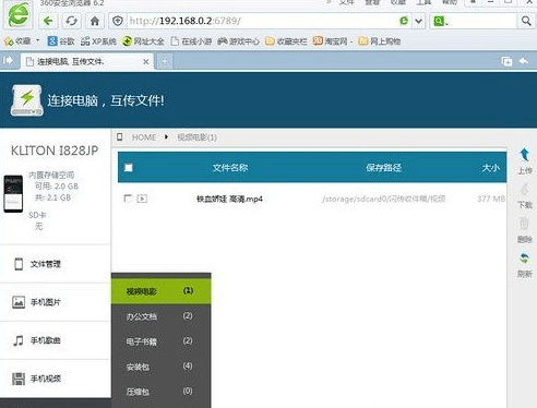 还把手机中的文件进行了分类如办公文档、电子书籍、安装包、压缩文件、大文件等,在文件管理中查找不到时,也可在文件分类中找到,通过浏览器管理手机文件这种思考设计非常的人性化。