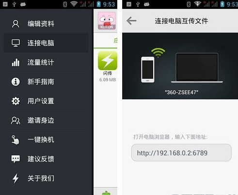 打开闪传的连接电脑功能,点击WiFi设置,比如搜索网络名为“360-ZSEE47”的网络,输入连接密码,获取专属连接地址,在浏览器中输入就可以跟电脑互传文件了。