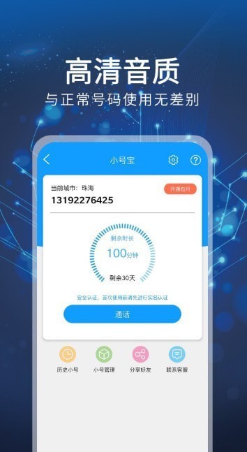 v1.0.1【安全放心】认证无广告、无病毒、无推送;【简单放心】操作简单,在线选购通话时长和手机小号;【实惠放心】可选择单个小号付费办理套餐、更多选择更多优惠;【消费放心】新用户可免费获得一次试用机会;【质量放心】高清音质,三大运营商用户均能使用!