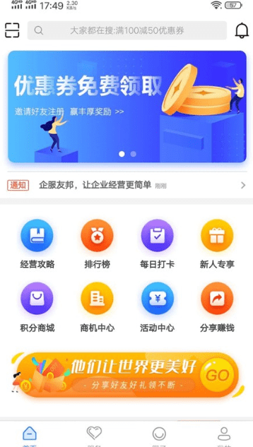 企服众邦app是一款效率办公类软件,这里面有各种公司管理所必备功能,商标注册,行业消息流通快。用户的界面清晰明了,上手简单,有兴趣的小伙伴开来下载试试吧!!