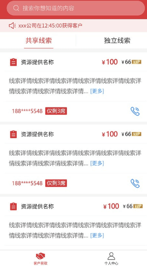 线索一键搜索,输入关键词的话即可快速的找到与之相关的全部客户线索资源;