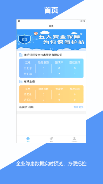 3、首页展示员工及企业的隐患排查统计数据;发布页可由员工提交公司隐患给安全员,进行整改安排与审核。