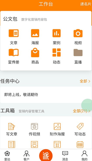 派知客app是一款深受用户喜爱好评的手机办公应用软件,为销售人员提供了很方便,在手机上就可以直接管理客户信息,还能生成专属名片,提高了销售工作的效率,有需要的朋友快来下载吧!