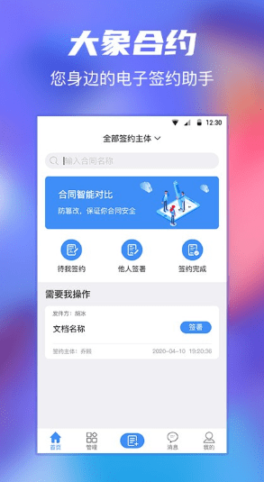 大象合约app是一款专门签订电子合同的手机办公软件,让用户更加方便云签约,所有电子合同都可以在这里完成,帮助用户降低成本,提高了工作效率,有需要的朋友快来下载吧!
