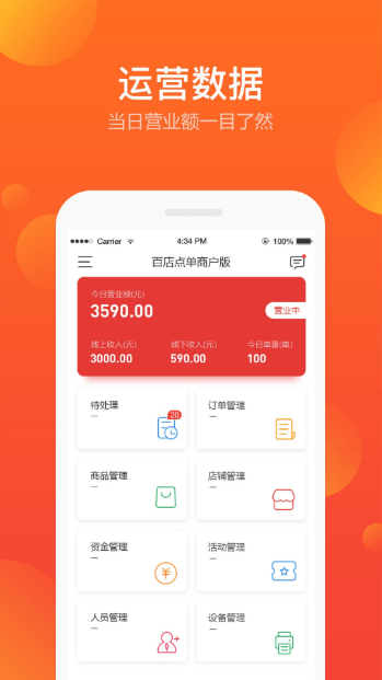 百店点餐宝商家端平台是一个支持商家管理店铺,上传商品、在线接单、管理订单、打印订单小票、线上账单管理、提现、发布店铺活动、进行店铺人员管理的便捷软件。