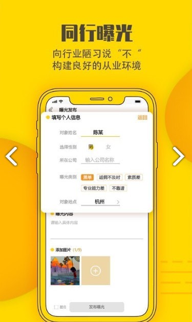 一键曝光同行,如果发现同行有违规操作的话则可以在这里曝光对方以维护行业的从业环境;