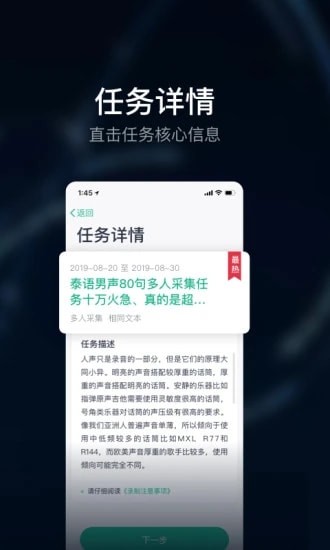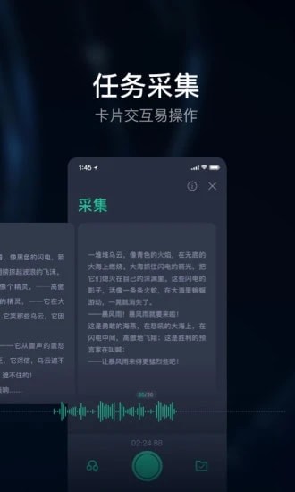 智能推荐最新、最热的语音数据采集任务,通过录制相关音频内容的方式帮助完成采集任务;