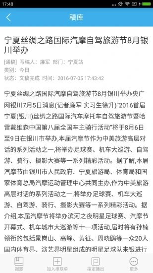 【我的工作】记者和用户可在线完成选题策划、稿件制作、文稿审核和评定及查看直播安排等采编工作