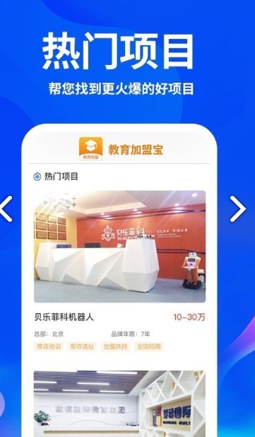 教育加盟宝app是一个一站式教育加盟创业服务平台,教育加盟宝app具有严格的审核标准,为创业者提供海量教育加盟优质项目,让创业更轻松放心。