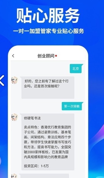 经验丰富的加盟管家提供一对一指导,协助您挑选项目、帮助您对接企业、帮您定制加盟计划。