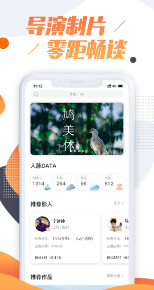 人脉板块功能可以看到知名编剧、导演、艺人、制片人等作品与社交信息,扩展人脉,便捷的与行业人士取得联系,搭建制作团队,提高整个影视作品制作周期。