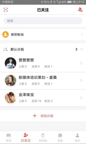 查看我的关注列表,能够以群组分组管理自己的粉丝