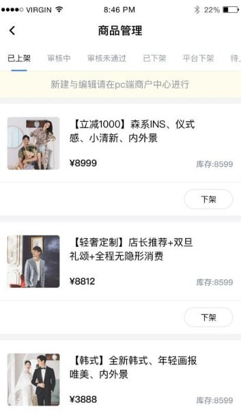 详细的商品管理信息,已上架、审核中、审核未通过、已下架、平台下架等等信息;