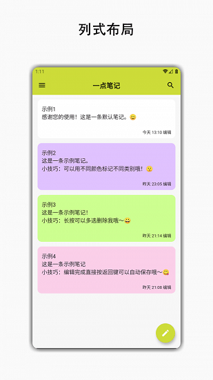 一点笔记是最新推出的一款记事软件,用户可以在线记录自己的日常生活、规划、待办事项等信息,通过色彩、标签等进行分类,所有信息都可以云端保存,可以通过备份导入导出来迁移记录,所有功能都是免费的,还有安全的密码锁致力于保护用户的隐私安全,轻松提高用户的记事效率。