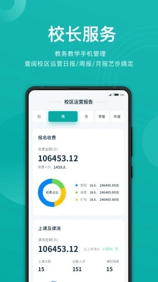 【教务管理】:按不同的时间段统计校区“报名收费”、“上课及课消”、“收支概况”,通过统计“授课课时”、“课消金额”、“出勤统计”的实时数据,帮助校长实时掌握校区教务信息。