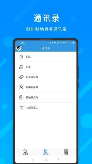 随时随地查看通讯录,可添加船队信息,也可删除;