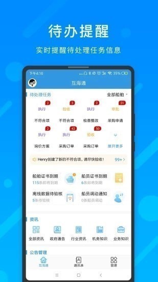 互海通APP一款专注于船舶管理的服务平台,提供各种保养管理、维修管理、船员调配、采购申请、采购订单查询、库存管理等服务。提供海量资讯,资讯每天实时推荐,能够及时掌握最新的资讯动态,通过对这些资讯的掌握,全面提高您的船舶知识量。船队在线互动交流,轻松在线安排日常工作,线上工作交流,提高整个工作效率。