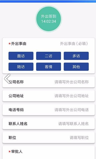 当员工外出办公的时候,还可以在外签到,面访客户、暗访客户等情况都可以申请在外打卡,高效记录用户的外出情况。