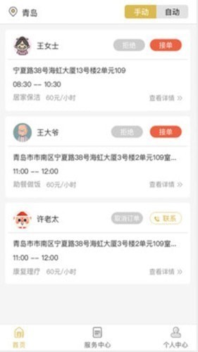 金海牛管家,为服务人员所打造,让你可以更好照顾老人的app,平台的主要服务对象是老年人,这里会有很多订单,他们会在这里下订单,大家可以随时接取照顾老人,平台还有历史订单,让你随时查看自己的收入,需要的快来下载金海牛管家吧。