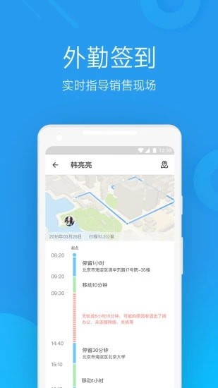 外勤签到,位置精准到10米以内,照片添加实时水印,互动评论实时响应,数据均自动生成,无法私自更改,确保真实有效。外勤的时间、地点、拜访人集中汇总批量导出,方便快捷。