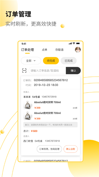 系统设计简单易用。服务员及时处理订单、为客户点单、存取酒。