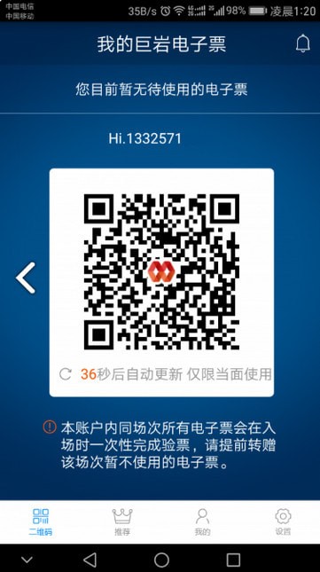 巨岩云票app是一款无纸化的电子票务应用,用户提供票务供应商买到票后,可以无需取票,登录巨岩云票即可查看相关的票务信息,并且支持扫描账户二维码进入场馆,为你免去排队取票的烦恼,还在等什么?