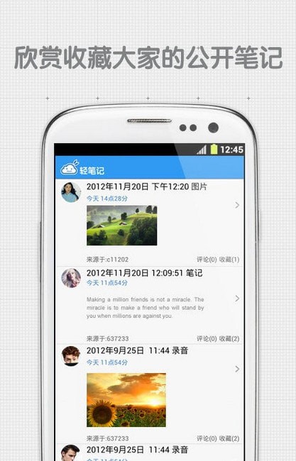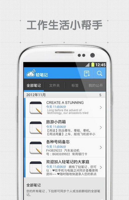 轻笔记app,首款与网盘结合的笔记软件,用百度帐号登录即享额外15GB空间和超快的访问速度,附件自动存储到网盘,独创的群组笔记功能,让您和同学共享课堂笔记,无需带电脑,随时随地用浏览器即可访问云端资料,同工作伙伴共同完成项目,小团队的移动WIKI和知识库任何成员的更改,提醒马上发送到其他人手机。