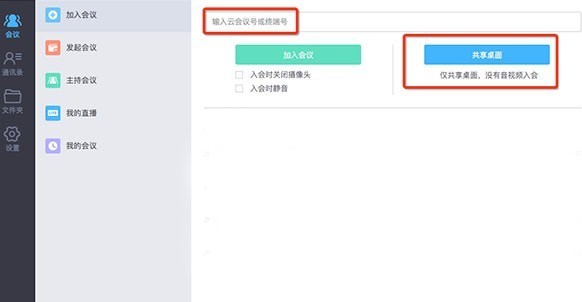 点击加入会议按钮,在对话框内输入云端会议号或终端号,点击共享桌面即可完成投屏操作。每个账号默认分配一个免费的云会议室,支持最多三方会议。再智能大屏上,打开客户端直接加入会议即可,无需登录。