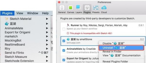 对于之前安装过蓝湖Sketch的用户,新版安装不生效时,第一步打开“Plugins”菜单找到“Manage Plugins” 打开第二步 找到 “蓝湖”右键单击 菜单里选择“Uninstall 蓝湖”第三步 重启Sketch 然后再次安装新插件