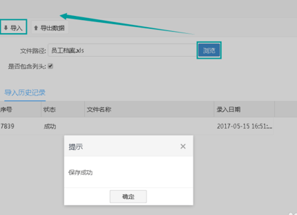 回到系统界面(组织人事->员工档案->员工导入),点击“浏览”选择编辑好的文件,再点击“导入”(如图)