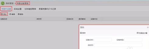 登录web端,点击系统管理->考勤设备管理,点击“添加”,在弹出的操作窗口中填写相关信息