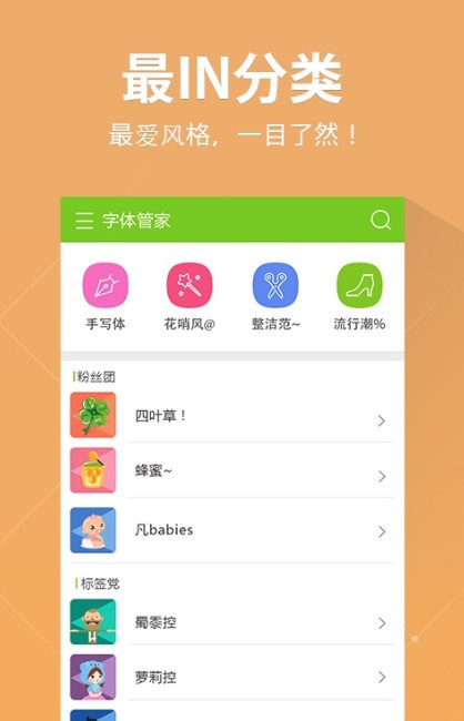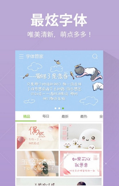 1.【字体内容最丰富,紧跟热门潮流】可爱、简约、酷炫、卡通、经典、唯美、个性、节日。EXO、TFBOYS字体...我在字体管家等你,约吗?
